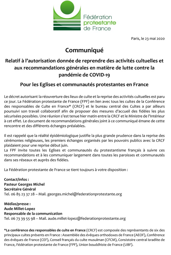 Communiqué de la Fédération protestante de France : reprise des activités cultuelles et recommandations générales